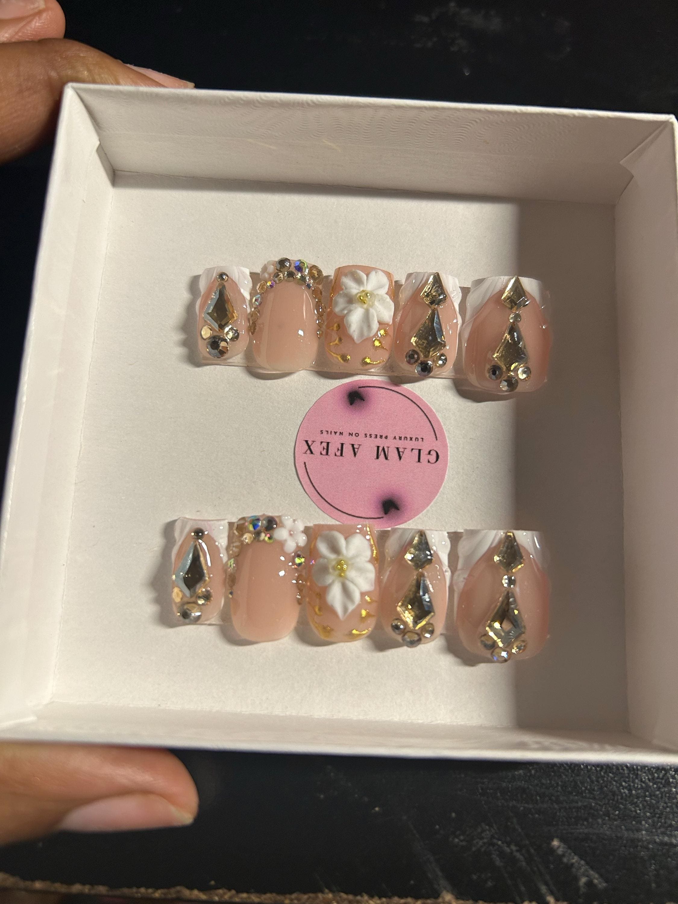 Set of 10 Custom made press on nails. Designed with Acrylic/Hard Gel for strength, thickness, and long lasting reusable nails.