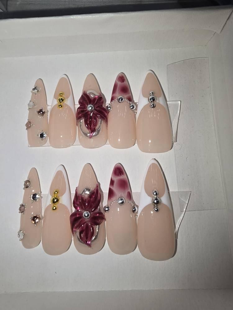 Set of 10 Custom made press on nails. Designed with Acrylic/Gel for strength, thickness, and long lasting reusable nails.