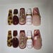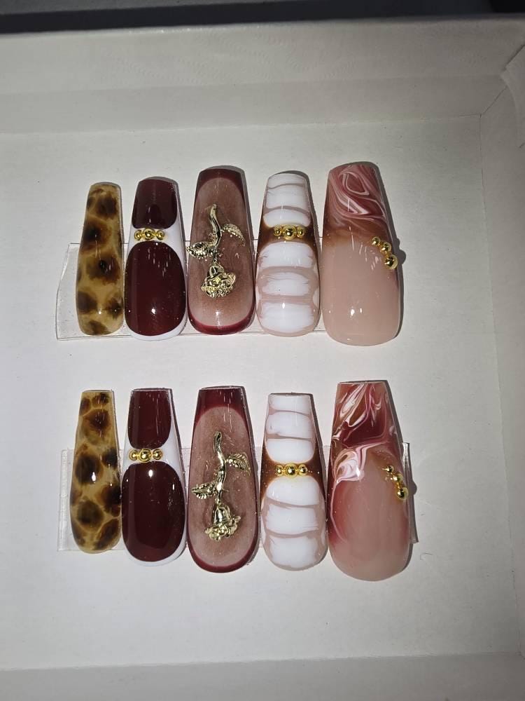 Set of 10 Custom made press on nails. Designed with Acrylic/Gel for strength, thickness, and long lasting reusable nails.