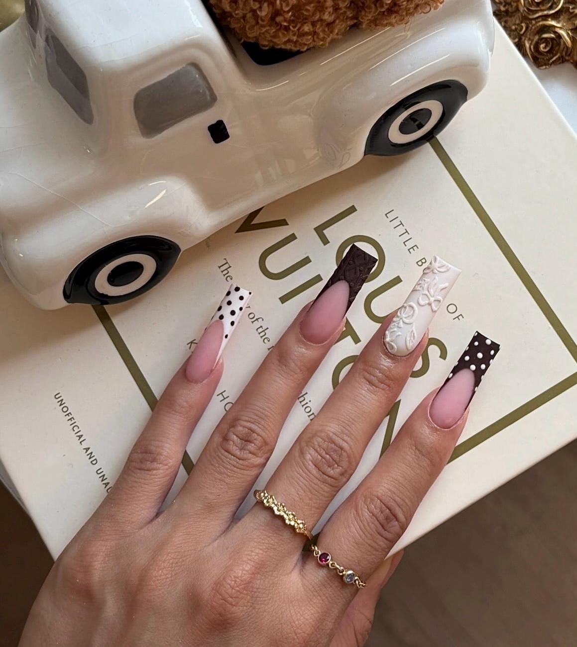 Set of 10 Custom made press on nails. Designed with Acrylic for strength, thickness, and long lasting reusable nails.